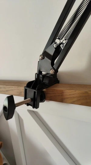 The clamp fits most flat surfaces up to 6 cm thick, like bed frames, nightstands, shelves, and desks. Use on smooth edges for the strongest hold.